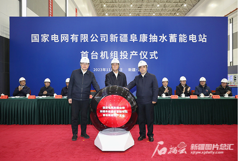 石榴云/新疆日报讯(记者 王兴瑞报道)11月25日13时15分,国家电网阜康抽水蓄能电站地下厂房里,伴随着水轮机运转的轰鸣声,1号机组开机发电,我国西北首台抽水蓄能机组正式投产。自治区党委书记马兴瑞、自治区主席艾尔肯·吐尼亚孜出席投产仪式,向工程投产表示热烈祝贺,并与国家电网有限公司总经理张智刚共同启动机组运行。