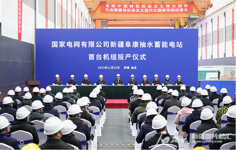 11月25日,西北地区首台投产发电的抽水蓄能机组——国家电网新疆阜康抽水蓄能电站1号机组投产发电。图为投产仪式现场。石榴云/新疆日报记者 崔志坚摄