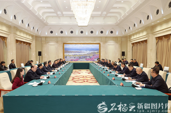 11月20日,自治区党委书记陈小江、自治区主席艾尔肯·吐尼亚孜在乌鲁木齐会见水利部党组书记、部长李国英一行。石榴云/新疆日报记者崔志坚摄