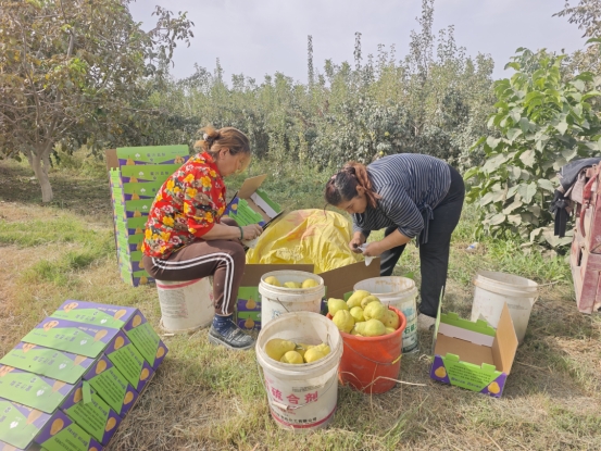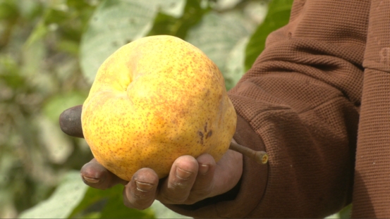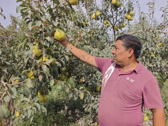 奥斯曼·艾合买提:“去年20亩地收了20吨丑梨,卖了大概25万。这几天也连续有收购商过来看,也提前预订了,预计产值能达30万。去年我们还扩大了种植面积,新种了50亩地丑梨,计划把这些地也管好,争取能有更多的收入。”