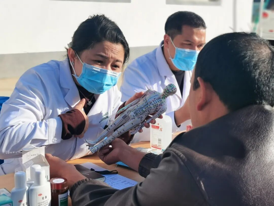 科普活动开展的同时,自治区维吾尔医医院的7名医护人员也在现场搭起了义诊台。神经外科、心血管内科、呼吸科、针灸科等领域的医护人员耐心为前来咨询的群众量血压、查病情,结合维吾尔医特色诊疗方法提供健康指导,开具个性化诊疗建议和药方,普及日常保健知识,让乡亲们在家门口就能享受到优质的医疗服务。