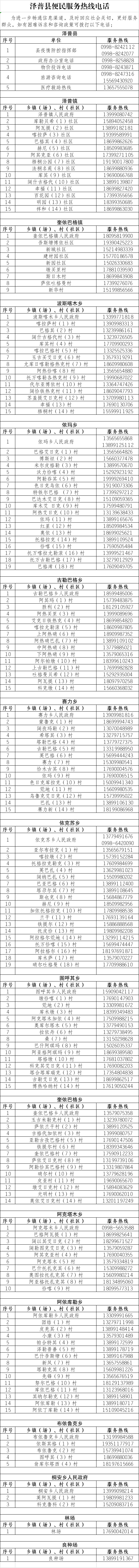 为进一步打赢疫情“攻坚战”,畅通信息沟通渠道,及时回应社会关切,更好服务群众,泽普县公布各乡镇村(社区)24小时便民服务热线,如有困难诉求和咨询政策可拨打以下热线电话。