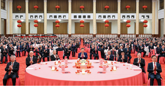 人民大会堂宴会厅灯光璀璨、喜气洋洋,各界人士2000多人欢聚一堂、共迎佳节,现场洋溢着欢乐祥和的节日气氛。