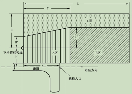 仪表着陆系统由机载航向、下滑、指点信标接收机和地面航向、下滑、指点信标发射机组成,为飞机提供航向道、下滑道和距跑道着陆端的距离信息,用于复杂气象条件下,按仪表指示引导飞机进场着陆,其电磁环境保护区包含于跑道保护区之中,具体区域划定如下。