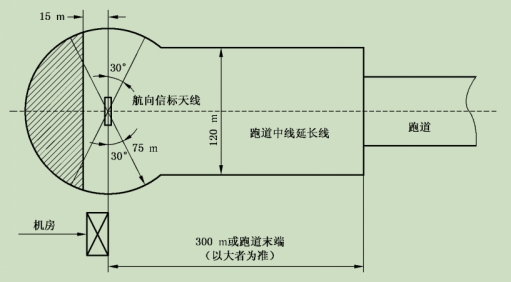 (1)航向信标台的扬地保护区是由圆和长方形合成的区域,圆的中心即航向信标天线中心,其半径为75m,长方形的长度为从航向信标天线开始沿跑道中心线延长向跑道方向延伸至300或跑道末端(以大者为准)宽度为120m,如图所示。如果航向信标天线辐射特性为单方向,且辐射场型前后场强比26dB以上,则保护区不包括图中的斜线区。