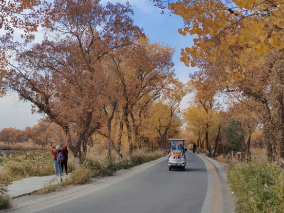 置身景区之中,层层叠叠的金黄枝叶织成“金色穹顶”,阳光穿透缝隙洒下细碎光斑,清澈河水倒映着挺拔的胡杨,微风拂过,流动的金色倒影宛如仙境。一路前行,千年胡杨或挺拔如剑,或虬曲如龙,树皮上深深的纹路镌刻着岁月的痕迹,“生而千年不死,死而千年不倒,倒而千年不朽”的生命传奇在此具象呈现,在油画般的风景中游客们仿佛穿越千年,站在古丝绸之路上,共同感受着祖先们的文化与生活,一呼一吸之间尽是大自然的馈赠,更是向往自然的原始本性。