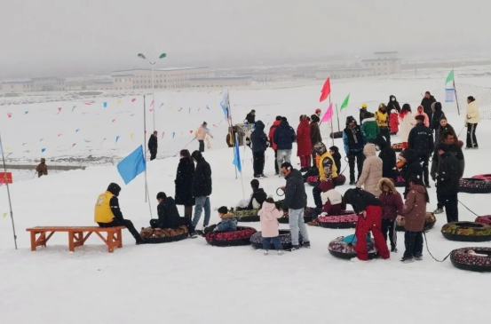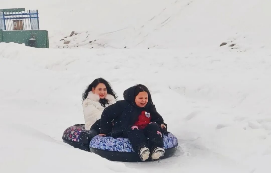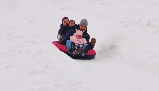 当日,在金湖杨滑雪场接待大厅内游客们有序排起长队,依次办理购票、领取滑雪板、滑雪鞋、雪圈等装备手续,现场秩序井然,换上专业装备的游客们兴致高昂地走进雪场。在滑雪场内初级雪道上,初学者小心翼翼地练习转弯、刹车,偶尔的摔倒也丝毫不影响兴致,爬起来继续尝试。经验丰富的滑雪爱好者则在雪道上疾驰穿梭,身姿轻盈矫健,留下一道道优美的弧线。雪圈区更是欢乐的海洋,家长带着孩子组成“雪圈接龙”,从雪道高处顺势滑下,尖叫声、欢呼声与笑声响彻整个雪场,成为元旦假期最动听的旋律。不同年龄段的游客都能找到属于自己的冰雪快乐,各得其乐,热闹非凡。